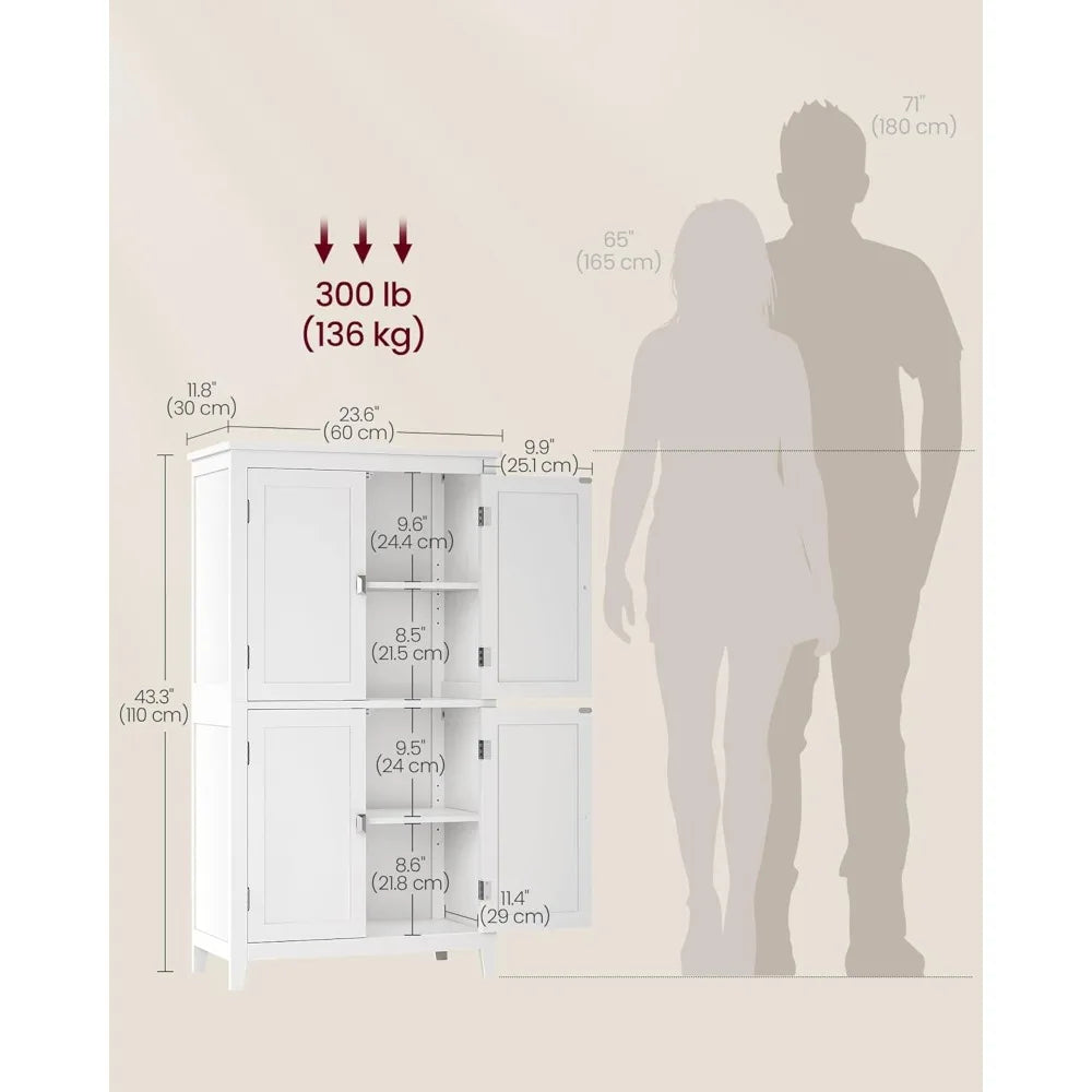 Featuring four paneled doors and adjustable interior shelves, this cabinet provides versatile storage for towels, toiletries, cleaning supplies, or personal items. The sturdy construction ensures long-term durability, while the sleek, freestanding design complements both modern and traditional décor styles. Its smooth surface is easy to clean and maintain, making it a convenient and stylish addition to any space.